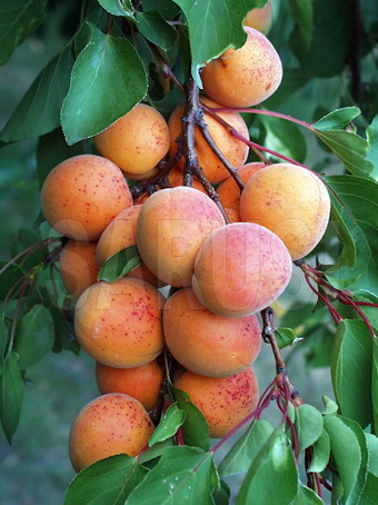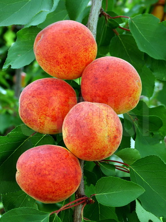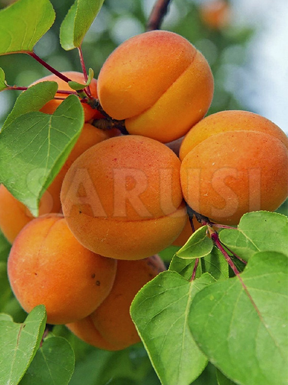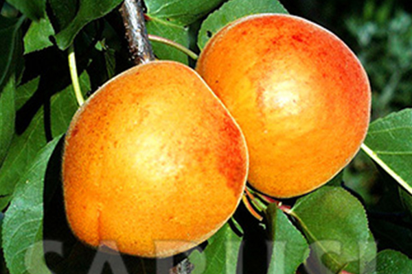 Fructele sunt mijlocii spre mare (45 - 50 gr), formă ovoidă, culoare portocalie cu roșu carmin pe partea însorită, cu aromă bună.